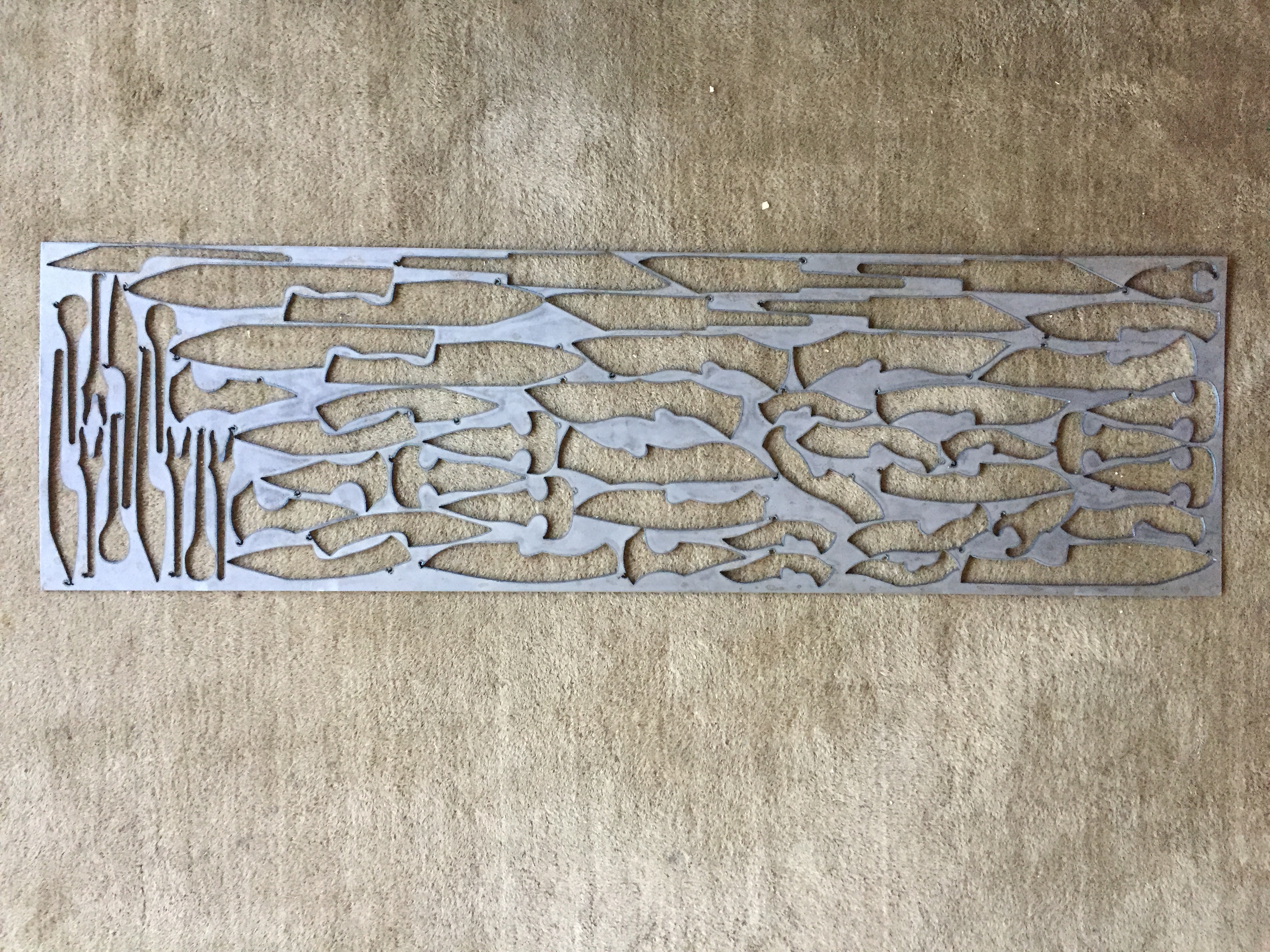 This was 1/8” 80crv2. I gave the customer a discount for leaving the slag on since it was less work for me and no difference for him. Another customer took the skeleton to mount on a piece of wood and hang on their wall.